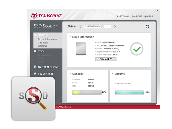 Afin de garder votre SSD Transcend au maximum de ses performances, sans erreurs et propre, le programme en téléchargement gratuit SSD Scope a été développé pour fonctionner avec le SSD370. SSD Scope vous permet de contrôler le statut de santé du SSD370 grâce à la technologie S.M.A.R.T., de maintenir des vitesses d'écriture optimales en activant la commande TRIM et de mettre à jour le firmware du SSD, le tout sous une interface claire et agréable.