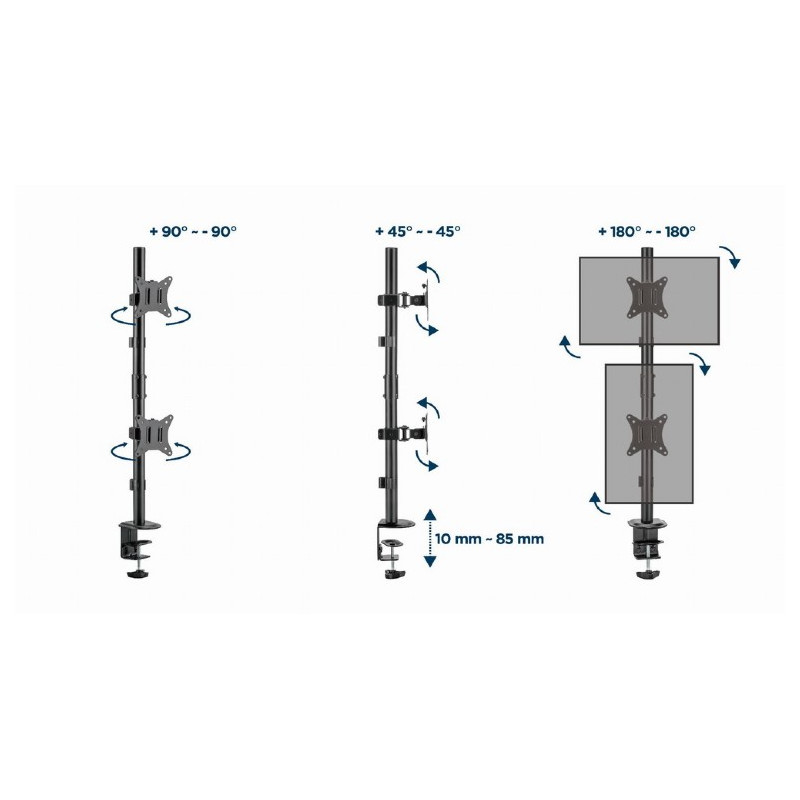 Support de bureau GEMBIRD pour 2 écrans - Taille de l'écran: 17" - 32" - Supporte 2 Ecrans - Poids maximum du moniteur: 9 kg - Compatible Vesa: 100x100 / 75x75 mm - Plage d'inclinaison: +45° ~ -45° - Plage de pivotement: +90° ~ -90° - Rotation d'écran: +180°~-180° - Poids 3.3 kg -Dimensions: 116 x 146 x 957 mm - Garantie 1 an