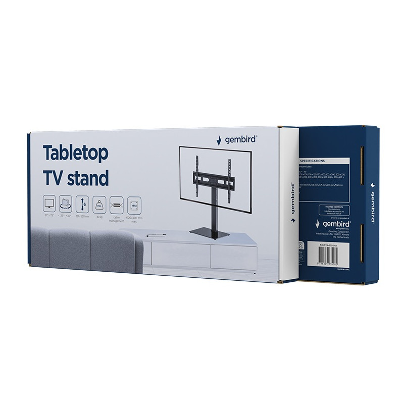 Meuble TV de table Gembird - Taille d'écran compatible : 37" à 75" - Charge maximale : 40 kg - Réglage en hauteur : 361 / 418 / 436 / 475 / 493 / 550 mm - Angle de rotation : -35° à +35° - Gestion des câbles - Permet de pivoter jusqu'à 70 degrés - Matériaux : Acier, plastique, verre trempé - Compatibilité VESA : 75x75, 100x100, 100x150, 150x100, 100x200, 200x100, 150x150, 200x200, 300x200, 400x200, 300x300, 400x300, 400x400, 600x400 - Couleur noir - Garantie 1 an
