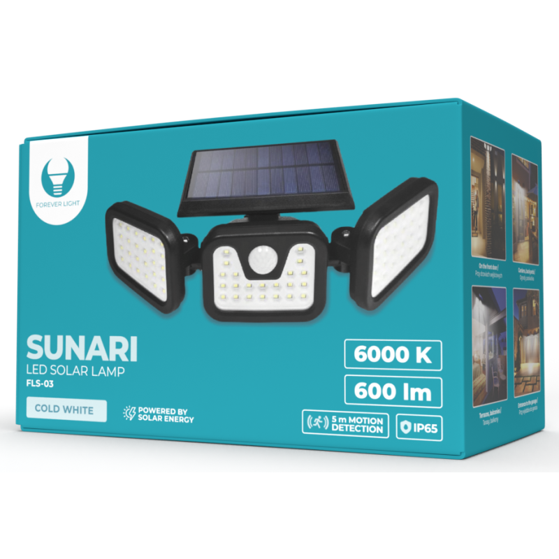 Lampe solaire LED Forever Light SUNARI - Température de couleur : blanc froid - Temps de travail : 6 heures - Fonctions : recharge solaire - Nombre de lumens : 600 lm - Puissance : 8W - Type de diode : CMS - Protection IP65 résistance à l'humidité et à la poussière - Détection de mouvement : 5M - Lumineuse dès la détection d'un mouvement pendant 20 secondes - Dimensions L x l x H : 277 x 103 x 65 mm - Garantie 1 an