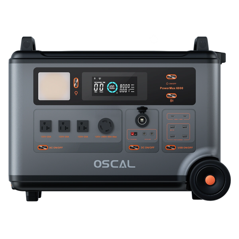 STATION OSCAL PowerMax 6000 - Type de batterie : LFP (LiFePO4 battery) - Capacité de la batterie : 3600 Wh - Plus de 3500 cycles jusqu'à 80 % de la capacité d'origine - Évolutivité : Fonctionne avec le PowerMax 6000 - Système de gestion de batterie (BMS) - Charge et décharge simultanées - Température de charge : 0°C~50°C - Température de décharge : -20°C~55°C - Température de stockage : -10°C~45°C - Contrôle par application : Oui, via WiFi et Bluetooth - Dimensions : 590 x 350 x 441 mm - Poids : 36 Kg - Garantie 1 an
