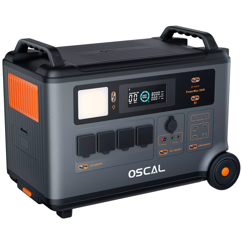 STATION OSCAL PowerMax 3600 - Type de batterie : LFP (LiFePO4 battery) - Capacité de la batterie : 3600 Wh - Plus de 3500 cycles jusqu'à 80 % de la capacité d'origine - Puissance de sortie maximale de 4 x 3600 W - Type d'onduleur : onde sinusoïdale pure - Puissance de crête : 7200 W - 1 port USB-A 12 W, 3 ports USB-A 18 W, USB-C 100 W x2 - Port allume-cigare : Briquet 120W x1 - Entrée de l'adaptateur secteur : 2200 W (max.) - Temps de recharge : 1,96 h - Entrée solaire : 1600 W (max.), Temps de recharge : 2,25 h - Entrée de la voiture : 120 W (max.), Temps de recharge : 30 h - Contrôle de l'application via Wi-Fi et Bluetooth - Dimensions : 590 x 350 x 441 mm - Poids : 44.45 Kg - Garantie 1 an
