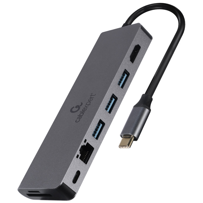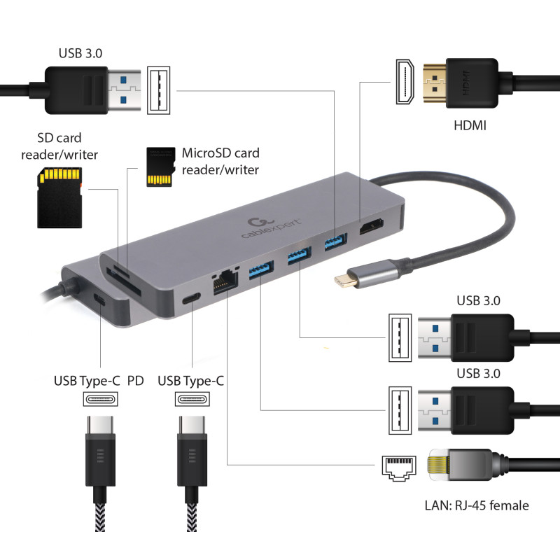 Adaptateur multiport USB Type-C 5 en 1 - Entrée : USB 3.0/3.1 Type-C mâle - longueur du câble : 15 cm - Sortie USB : 3 x Type-A (femelle), USB 3.1 Gen 1 (5 Gbit/s) - Sortie HDMI : Type-A (femelle), résolution maximale : 4K à 30 Hz - Port USB Type-C PD : jusqu’à 100 W (PD 3.0) - LAN : Gigabit, port RJ45 - compatible LAN Gigabit 10/100/1000 Mbps - Lecteur de carte SD : compatible avec les cartes jusqu’à 128 Go - Dimensions : 105 x 41 x 18 mm - Poids net : 85 g - Couleur Gris - Garantie 1 an