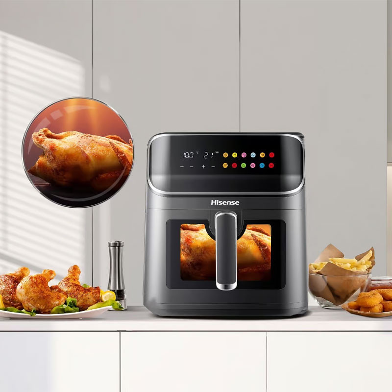 AIR FRYER HISENSE - Capacité : 6,7 Litres - Puissance : 1350 W - Nombre de programmes : 10 programmes de cuisson préréglés - Température Réglable : de 80 °C à 200 °C - Écran couleur Tactile - Cuisson Chaleur tournante à 360° - Plaque de cuisson amovible pour un nettoyage facile est peut être remplacée par une grille en fonte d'aluminium - Grande Fenêtre transparente de surveillance pour une cuisson fluide - Interface Tactile numérique intuitive - Dimensions : 420 x 335 x 365 mm - Couleur : Noir - Garantie 1an