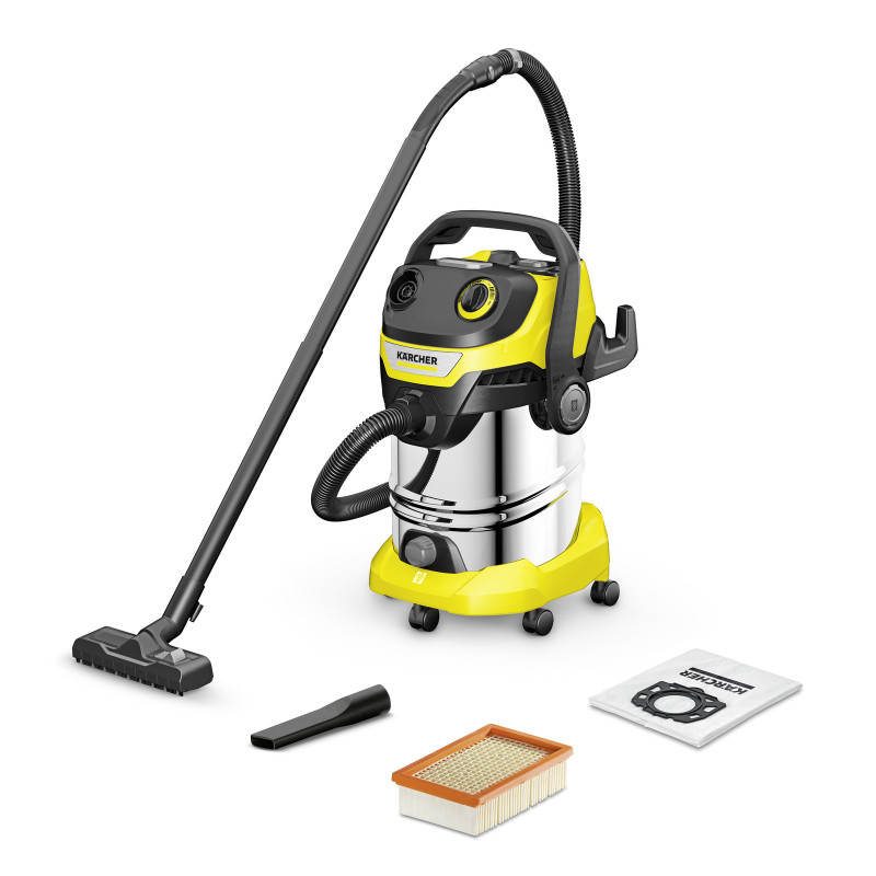 ASPIRATEUR MULTIFONCTION KÄRCHER WD5 S-V - Puissance: 1100 watts - Volume de la cuve: 25 Litres - Matériau de la cuve: Acier inox - Cable d'alimentation: 5 métres - Alimentation: 220-240 / 50-60 hrz - Accessoires: Flexible d'aspiration 2.2 métres avec poignée incurvée en Plastique, Tube d'aspiration, 2 pièces de 0.5 m et 35 mm en Plastique, Suceur d'aspiration eau/poussières, Suceur fentes, Sacs filtrants en non-tissé - Poignée amovible avec protection électrostatique - Fonction de soufflage - Protection anti-chocs lors des déplacements - Rangement des accessoires inclus sur l'appareil - Fonction Nettoyage de filtre - 5 Roulettes orientables - Position de stationnement - Poignée de transport 3 en 1 confortable - Interrupteur (marche/arrêt) - Dimensions: 418 x 382 x 646 mm - Poids: 8.6 kg - Couleur: Noir et Jaune - Garantie 1 an