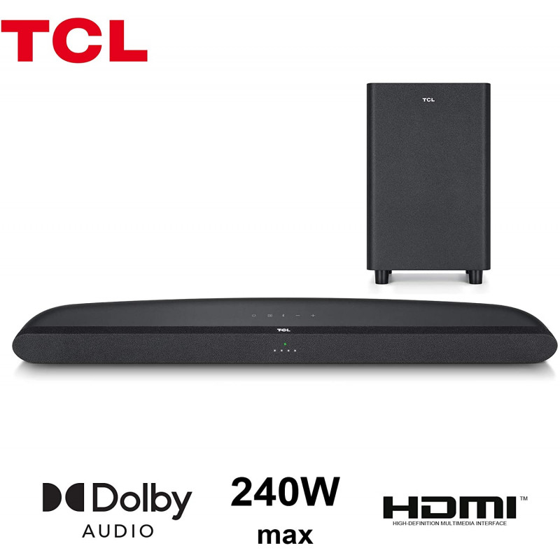 Taille de la barre de son 800 x 62 x 107mm - Taille du caisson de basses 200 x 325 x 200mm - EQ settings - Puissance sonore maximale 240W - Canaux 2.1 CH - Traitement du son Dolby Audio - HDMI-in BT (v4.2) - HDMI(1.4)-ARC - 3.5mm AUX - Port USB - Kit de montage mural - Garantie 1 an
