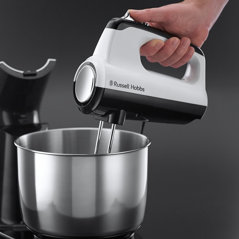 Batteur sur Socle Russell Hobbs Horizon - Puissance: 350 W - 5 vitesses réglables - Fonction turbo - Capacité: 3.5 L - Bol en Acier inoxydable - 2 fouets et 2 crochets pétrin chromés - Batteur amovible - Accessoires compatibles au lave-vaisselle - Garantie 1 an
