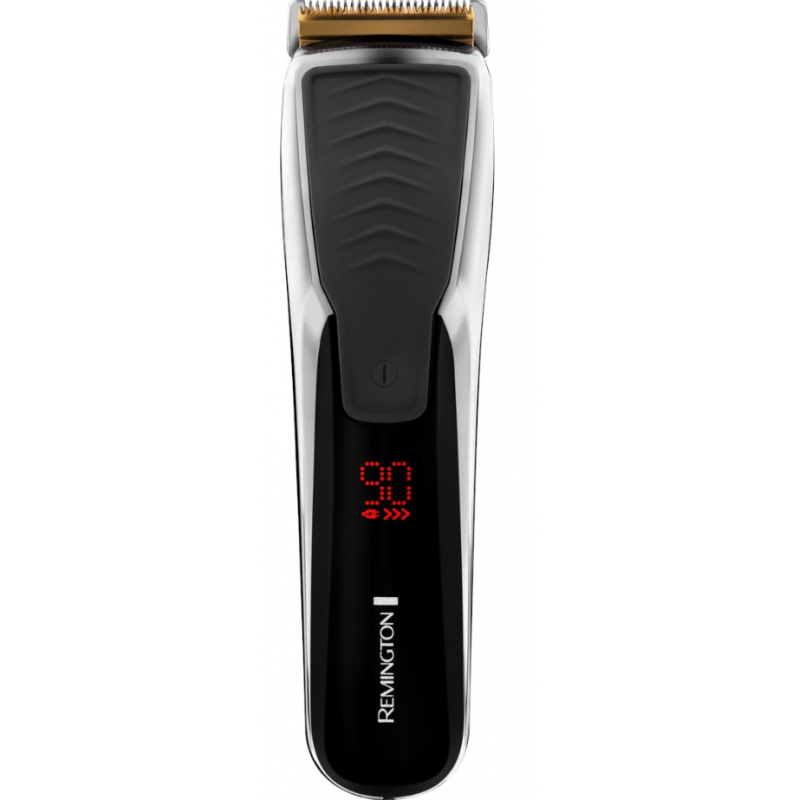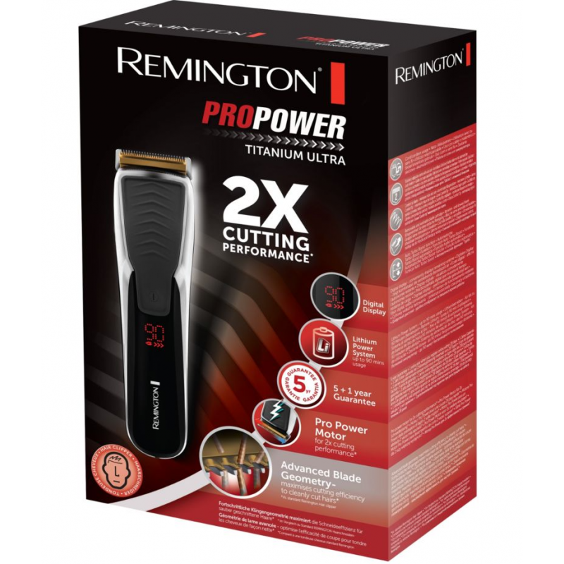 Tondeuse à cheveux professionnel Remington Ultra Power Titanium - Moteur Pro: 2X plus RAPIDE avec fonction autoboost - Lames revêtement Titanium - Géométrie de lame avancée: coupe nette et précise - Lames AcuAngle  et ComfortTip: évite coupures et irritations - 2 guides ajustables - Système de réglage SlideSelect et verrouillage automatique - 17 hauteurs (0,5-44 mm) - Utilisation avec ou sans fil - Ecran digital - Batterie Lithium - Autonomie: jusqu'à 90 min - Temps de charge: 4 heures Charge rapide - Témoin de charge - Entièrement lavable - Technologie micro USB - Finition chrome - Garantie 2 ans