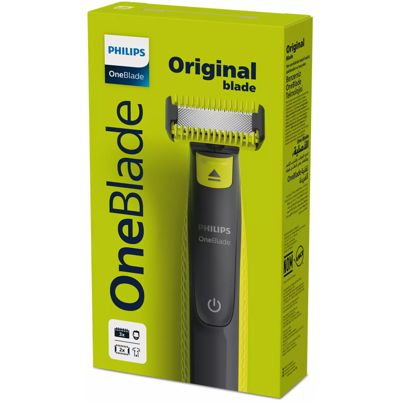 Tondeuse Philips OneBlade Hybride Visage et Corps - Système de rasage - Système de coupe - Capuchon de protection - Peigne: Protection cutanée à clipser, Peigne corporel clipsable, Peignes à chaume (1,3,5 mm) - Lame supplémentaire remplaçable - Type de batterie: Ni-MH Rechargeable - Tension automatique: 5 V - 8 heures de charge complète - Durée du charge 45 minutes - Consommation maximale: 0.5 W - Adaptateur USB-A - Couleur Vert lime - Garantie 1 an