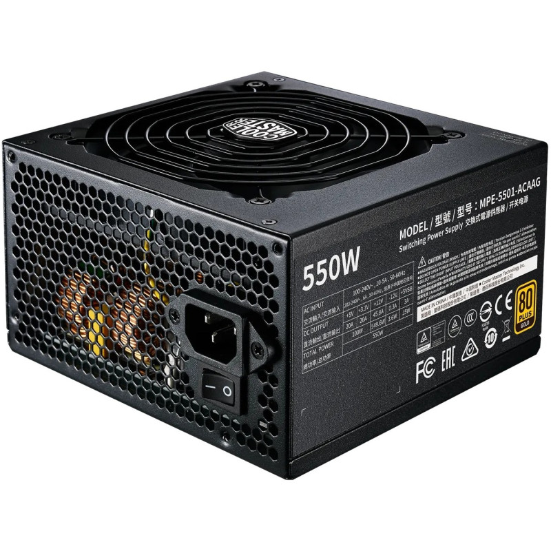 Boite D'Alimentation Cooler Master - Puissance : 550 W - Norme : Certification 80 PLUS Gold - Format Alimentation : ATX - Taille de ventilateur : 120 mm - Tension d'entrée AC : 100 - 240V - Fréquence : 50 - 60 Hz - Connecteurs alimentation : 1x alimentation ATX 24, 1x alimentation EPS12V 8 broches avec section détachable de 4 broches ATX12V, 6x alimentation ATA série de 15 broches, 4x alimentation interne 4 plots, 2x Alimentation PCI Express de 8 broches avec section détachable à 2 broches - Dimensions : 16 x 15 x 8.6 cm - Garantie 1 an
