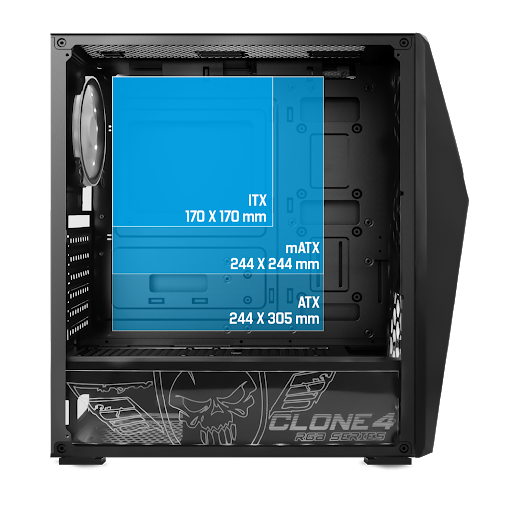 Le rétroéclairage RGB configurable du Clone 4 fait de ce boîtier une reférence incontournable pour les joueurs en quête d'un boîtier original qui ne saurait passer inaperçu. Dans un premier temps vous serez charmés par sa façade bombée équipée d’une bande LED ARGB. Dans un second temps vous serez impressionnés par le ventilateur Spectrum ARGB de 120 mm postionné à l'arrière. Et, enfin dans un troisième temps vous serez subjugués par ce que vous trouverez derrière la paroi latérale en verre trempé montée sur charnières ! Ce sont donc de sublimes LED ARGB dissimulées derrière le compartiment de l’alimentation qui illuminent de mille feux le logo emblématique de Spirit Of Gamer. Pour garder la main sur cet éclairage le Clone 4 est équipé d'un contrôleur Lighting System intelligent. Mais il est aussi compatible avec les systèmes ARGB Asus Aura Sync, RGB Fusion Ready, MSI Mystic Light Sync, ASROCK Polychrome Sync..png)