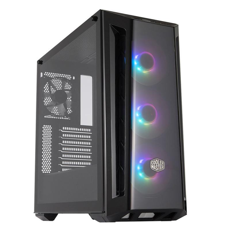 Boitier Cooler Master MasterBox MB520 - 3 ventilateurs ARGB à l'avant de 120 mm - Compatible avec les cartes mères ATX, Micro-ATX, Mini-ITX - Boitier Moyen Tour avec fenêtre latérale tranparent - 2x Baies 2.5"/3.5" - 4x Baies 2.5" - Longueur max. carte graphique 410 mm - Hauteur max. ventilateur CPU 165 mm - Longueur max. alimentation 180 mm - 2x USB 3.0 - Dimensions : 496 x 217 x 68 mm - Garantie 1 an