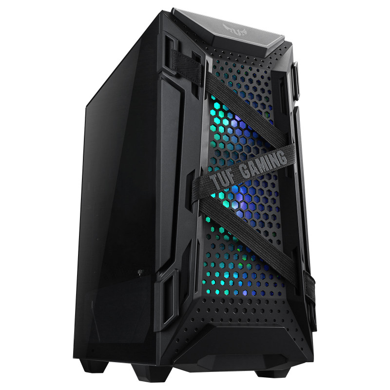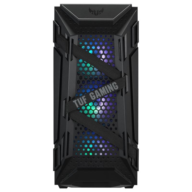 Boîtier Gaming ASUS TUF GT301 RGB - Boitier Moyen Tour compatible ATX / E-ATX / Micro ATX ou Mini ITX - Carte graphique jusqu'à 320 mm - 3 ventilateurs avant de 120 mm RGB fournis - 1 ventilateur arrière de 140 mm RGB et PWM fourni - Compatibilité Watercooling (radiateur de 360 mm maximum) - 3 filtres à poussière - 7 slots d'extension - Panneau latéral en verre fumé - Connectique avant avec 2 ports USB 3.0 + entrée & sortie audio - Câble management optimisé avec des passe-câbles intégrés - Couleur Noir