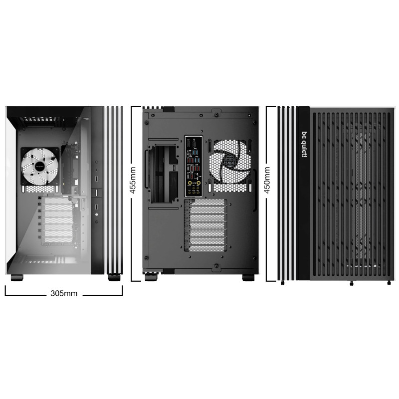 Boîtier Gaming be quiet! Moyen Tour ATX Light Base 600 LX - Dimensions avec les pieds (LxHxP) : 450 x 305 x 455 mm - carte mère : ATX / M- ATX / Mini -ATX - Baies de lecteur 3.5" : 2 (1 inclus), 2.5" : 4 (2 inclus) - Ventilateurs pré-installés : Ventilateur latéral : 3x Ailes légères LX inversées 120 mm PWM, Ventilateur arrière : 1x Ailes légères LX 120 mm PWM - Nombre maximum de ventilateurs : 10 - Hauteur maximale de refroidissement du processeur : 170 mm - Éclairage LED ARGB - Filtres à poussière : 1x Latéral - Panneau E/S : 1x USB 3.2 Gen. 2 Type C, 2x USB 3.2 Type A, E/S audio HD : Mic + Audio - Durée de vie à 25 °C : 60 000 h - Couleur Noir - Garantie 1 an