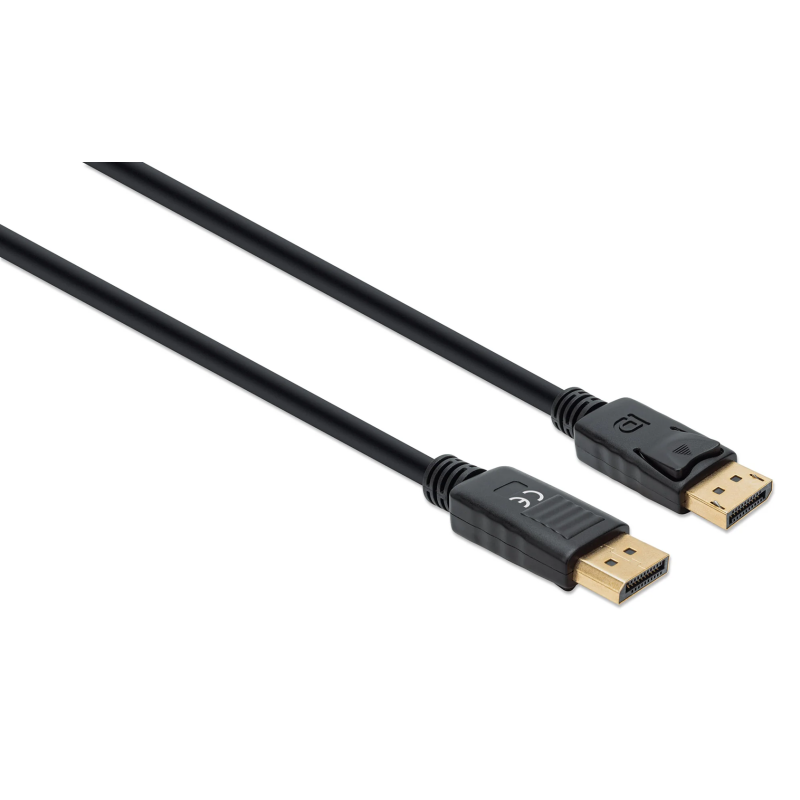 Câble DisplayPort 1.4 Mâle vers Mâle 8K@60Hz Manhattan - Connecteurs: Deux DisplayPort mâles à 20 broches avec loquets / 19 conducteurs - Contacts plaqué or - Boîtier en ABS - Câble 30 AWG - Triple blindage: tressage aluminium - Tension de tenue: 300 Vcc - Résistance d'isolation: 5 MΩ - Résistance de contact: 10 Ohms - Gaine PVC - Longueur: 2 m - Prend en charge Dolby Vision et Dolby Atmos - Couleur Noir
