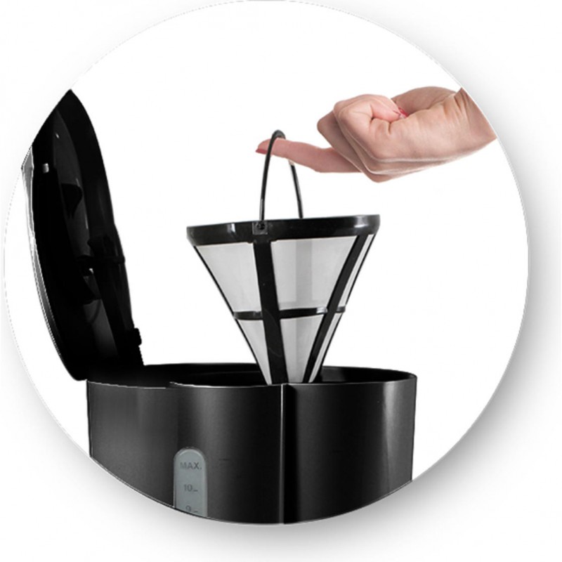 Cafetière filtre - Puissance 1000 W - Capacité 10/12 tasses - Verseuse en verre - Porte filtre suspendu - Stop gouttes - Maintien au chaud - Bouton marche / arrêt - Couleur: noir et inox - Garantie 1 an