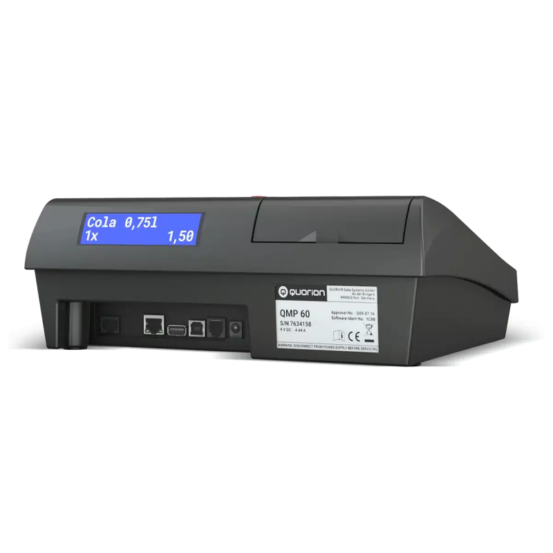 Caisse Enregistreuse intelligente QUORION QMP-60 - Affichage de l'opérateur : Écran LCD, multiligne avec rétroéclairage bleu, 192 x 64 pixels, graphique - Affichage client : Écran LCD, 2 lignes avec rétroéclairage bleu, 192 x 32 pixels, graphique - Impression : Imprimante thermique 58 mm - Logiciel de point de vente : QMP 2.0 - Processeur ARM Cortex-A9 400 MHz - Mémoire de travail : 32 Mo de SDRAM - Mémoire système : eMMC 4 Go - Interfaces : 1 x RS232-5V, 2 x USB (1 x USB type A, 1 x USB type B), 1 x LAN (100 Mbit), 1 x RJ11-9V pour tiroir-caisse - Dimensions :L x l x H : 290 x 240 x 110 mm - Poids : 2 Kg - Couleur Noir - Garantie 1 an
