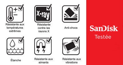 Les cartes mémoire SanDisk microSDHC Extreme Pro UHS-I sont conçues pour être étanches, résistantes aux températures extrêmes, aux vibrations, aux chocs et aux rayons X pour qu'elles continuent à fonctionner en toute circonstance.