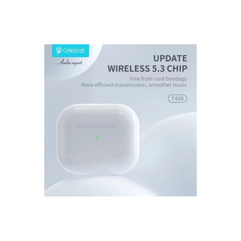 Écouteurs Sans Fil CELEBRAT TWS T400 - Bluetooth 5.3 - Portée de conversation 10 m - Batterie de la boîte de chargement 220 mAh - Temps de conversation environ 4 heures - compatible avec IOS/Android/Windows - Couleur Blanc - Garantie 1 an