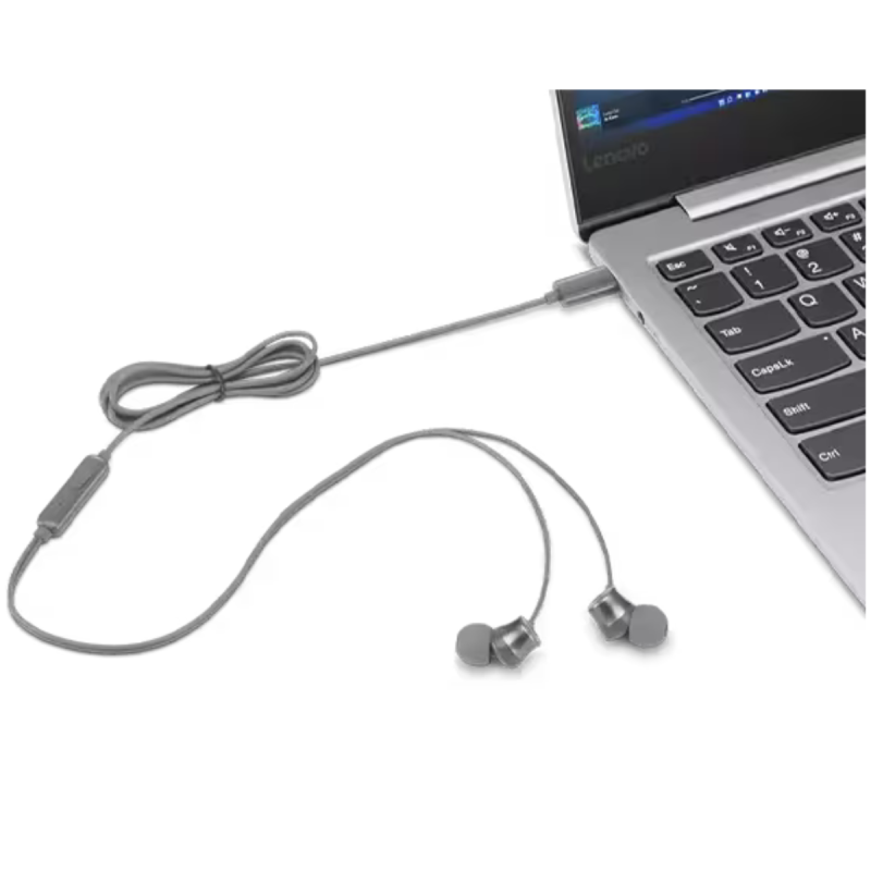 Écouteurs filaires intra-auriculaires Lenovo 300 - Longueur/type de câble: 1,2 m - Gamme de fréquences: 100 ~ 20 kHz - Impédance: 32 ohms - Puissance requise: 5 mW - Puissance RMS: 5 mW - Sensibilité: 110 dB - Entrée audio: 5 mW - Microphone integré: 100 ~ 10 kHz - Type de connexion: USB-C - Couleur Gris - Garanite 1 an