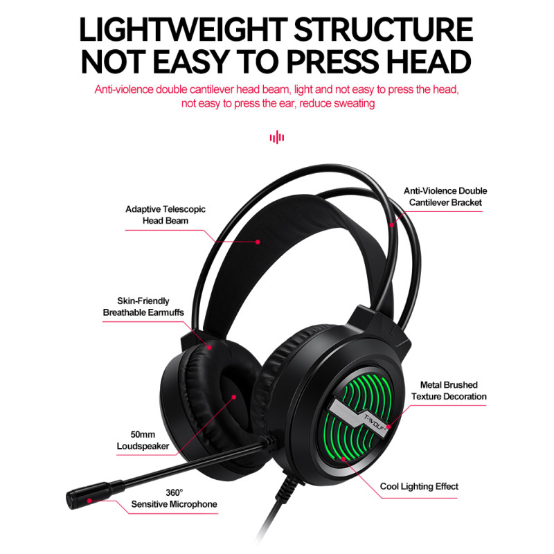 Micro Casque Gamer Filaire T-WOLF H130 - Diamètre des Haut-Parleurs : 50 mm - Connexion Filaire : Jack 3,5 mm x2, USB - Rétro-éclairage RGB - LED respiratoire à 7 Couleurs - Sensibilité casque : -38dB ± 3dB - Fréquence casque : 20 Hz ~ 20 kHz - Puissance nominale : 25 MW - Puissance d'entrée maximale : 40 MW - Impédance : 32 Ω ± 15 % - Taille de microphone: 4,0 × 1,5 mm - Longueur du câble : 2 m - Taille de Casque : 220 x 160 x 105 mm - Poids : 280g - Couleur : Noir - Garantie 1 an