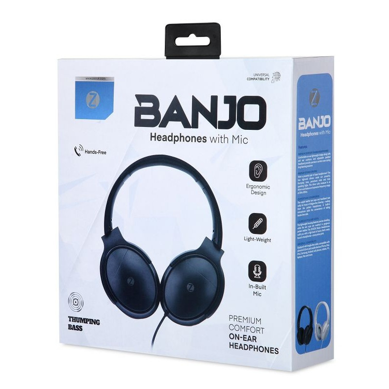 Micro Casque Filaire ZOOOK Banjo - Connectivité : filaire / extra bass, coussinets d'oreille super doux noir / Taille du pilote : 40 mm / Réponse en fréquence : 20Hz - 20 KHz / Sensibilité : 102±3dB / Capacité de gestion de puissance : 100 mW / Longueur du cable : 1.2 m / Connecteur : 3.5 mm - Couleur : Noir