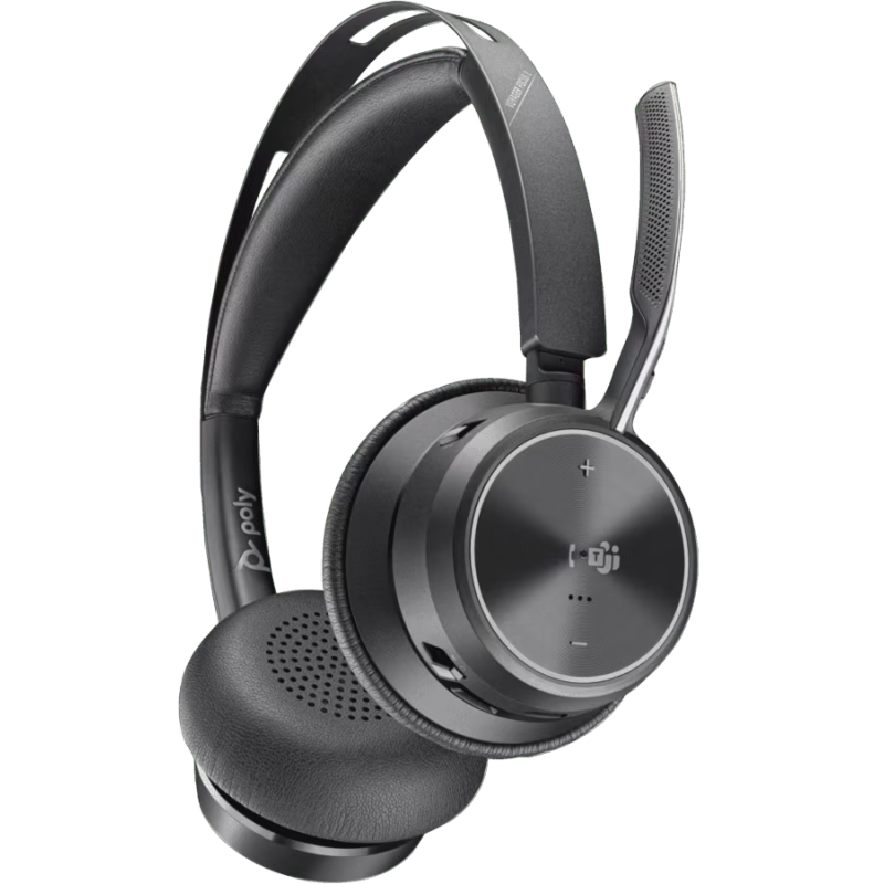 Casque Poly Voyager Focus 2 - Type de casque : supra-auriculaire - Réduction active du bruit (ANC) réglable - Fonctionnalités audio : Égalisation dynamique optimisée - Taille du haut-parleur : 32 mm - Type de microphone : 2 ECM analogiques, 2 MEMS numériques - Coussinets d'oreille : Cuir artificiel (matériau de surface) - Connectivité : Bluetooth, Sans fil (Clé USB) - Batterie lithium-ion rechargeable - Autonomie de la batterie : jusqu'à 40 heures d'autonomie en lecture musicale (ANC désactivé) | jusqu'à 24 heures d'autonomie en lecture musicale (ANC activé) | jusqu'à 30 jours d'autonomie en veille - Commandes utilisateur par bouton : Marche/arrêt, Répondre/raccrocher, Mode silencieux, Volume +/-, Appairage, Réduction de bruit active/désactivée, faible, élevée - compatibles : Windows 11, 10, macOS - Poids : 176 g - Couleur Noir - Garantie 1 an