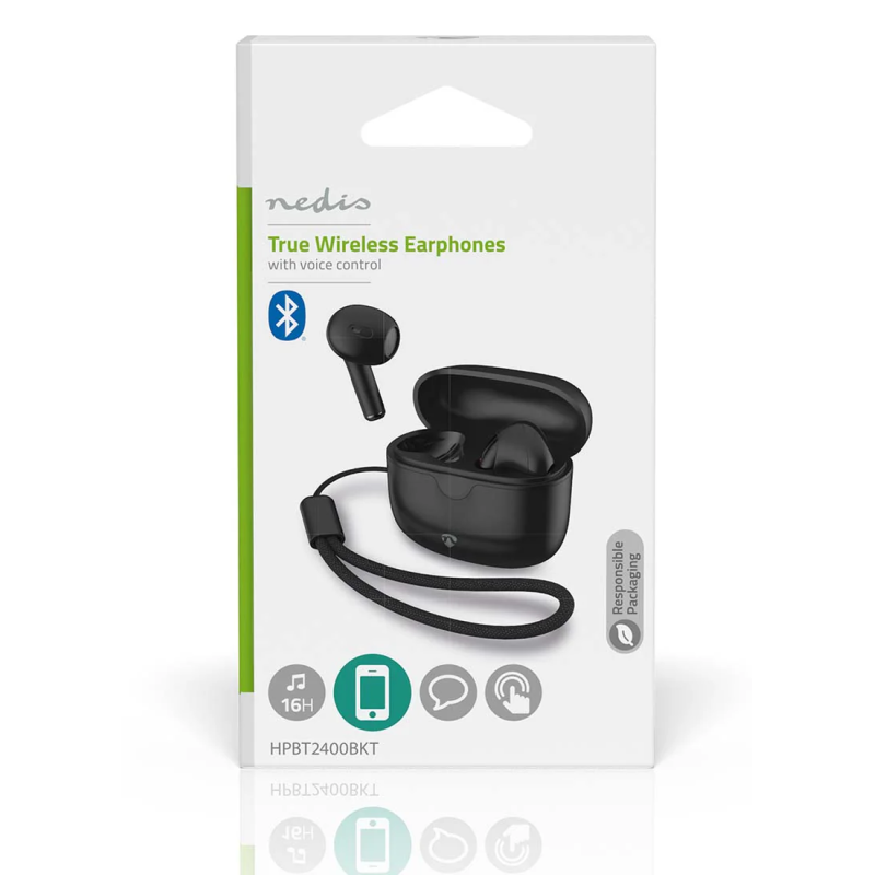 Écouteurs Sans fil Nedis - Type d'écouteurs : Intra-Auriculaire - Connexion : Bluetooth 5.3 - Portée du signal Bluetooth : 10 m - Taille du pilote : 13 mm - Capacité de la batterie des écouteurs : 30 mAh / boîtier : 250 mAh - Port de charge : Type-C - Autonomie de la batterie : 16 heures - Temps de veille maximum : 100 heures - Temps de charge : 2h - Impédance du haut-parleur externe : 32 Ohm - Microphone intégré - Réponse en fréquence : 20 Hz - 20 KHz - Contrôle tactile - Support de commande vocale : Google Assistant, Siri - Couleur Noir - Garantie 1 An
