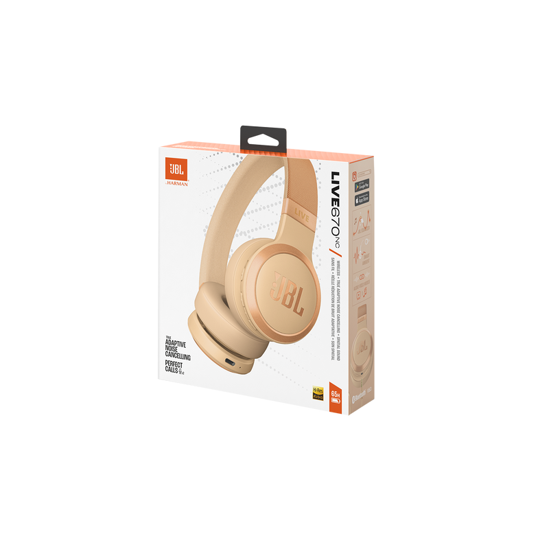 Casque JBL Live 670NC - Taille du pilote: 40 mm - Réduction du bruit - Type à réduction de bruit: Véritable réduction adaptative du bruit - Nombre de microphones - Sensibilité du haut-parleur à 1 kHz/1 mW: 98 dB - Plage de réponse en fréquence dynamique: 20 Hz - 20 kHz - Impédance: 32 ohms - Longueur du câble audio: 2 m - Bluetooth 5.3 - Connexion: Sans fil - Technologie de connectivité: Bluetooth - Temps de charge: 3 heures - Durée maximale de lecture musicale avec ANC: 50 heures - Durée maximale de conversation: 33 heures - Autonomie de la batterie: 65 heures - Caractéristiques: Son spatial / Reconnaissance vocale / Véritable réduction adaptative du bruit / pliable / Microphone intégré / Appel mains libres / Son signature JBL / Connexion multipoint - Couleur Beige - Garantie 1 an