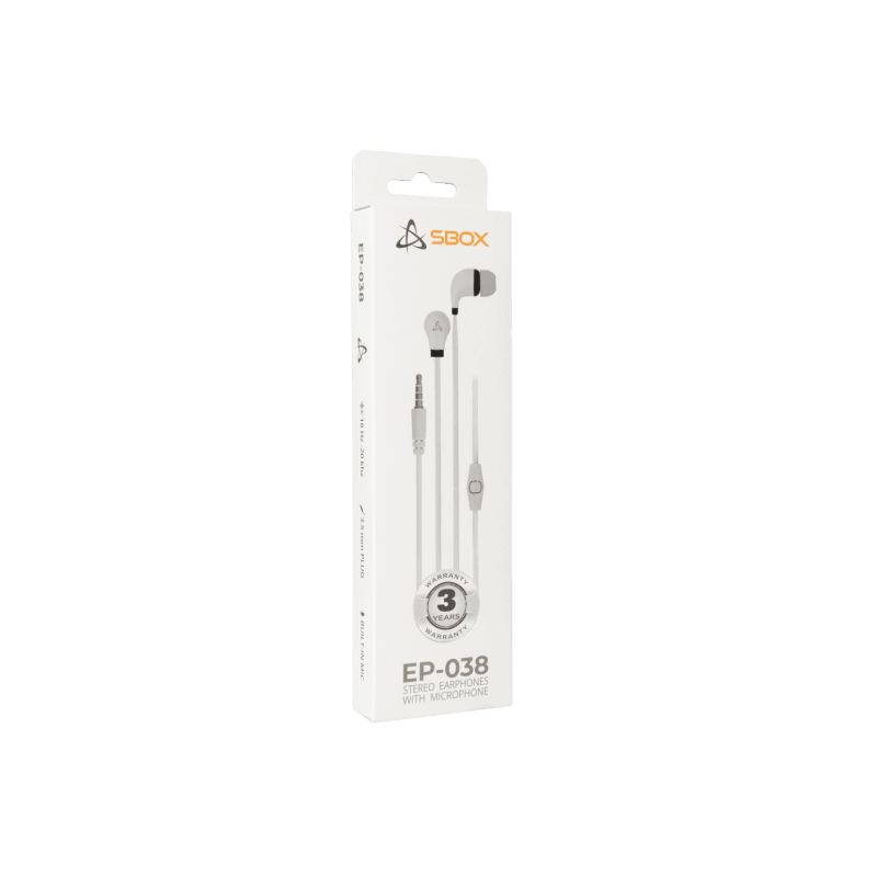 Écouteurs + microphone SBOX EP-038 - Type d'écouteurs : intra-auriculaires - Réponse en fréquence : 18 - 20 000 Hz - Impédance du casque : 32 Ohm - Sensibilité du casque : 116 ±3 dB - Interface : stéréo 3,5 mm - Bouton Répondre - Microphone - Longueur du câble : 1.2 m - Matière : plastique - Couleur Blanc - Garantie 1 an