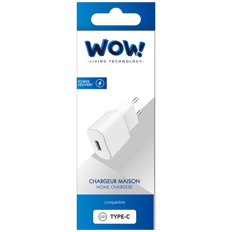 Chargeur USB-C PD Power Delivery Blanc WOW - Entrée: USB-C PD - Sortie: Universel - Puissance: 20W - Couleur Blanc - Garantie 1 an