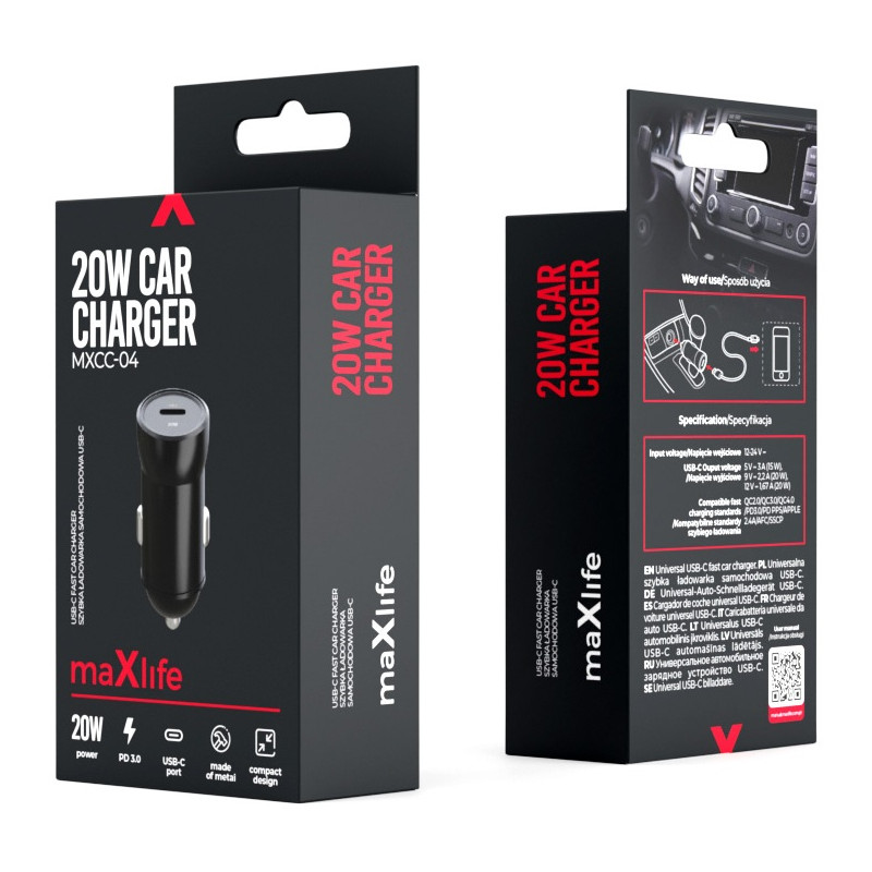 Chargeur de voiture Maxlife MXCC-04 PD QC 1x USB-C 20W / Noir