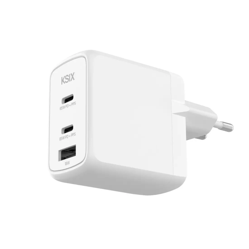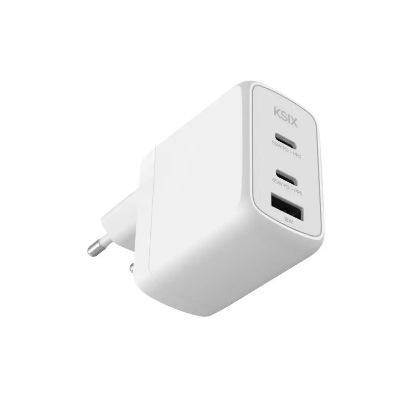 Chargeur mural KSIX - Nombre de ports : 2x USB-C, 1x USB-A - Puissance : 65 W - Technologie : GaN + PD + PPS - Charge ultra rapide avec Power delivery 3.0 - chargeur peut tout alimenter, des smartphones aux tablettes en passant par les ordinateurs portables. De plus, ses multiples ports offrent une variété d'options pour la charge simultanée - Couleur Blanc