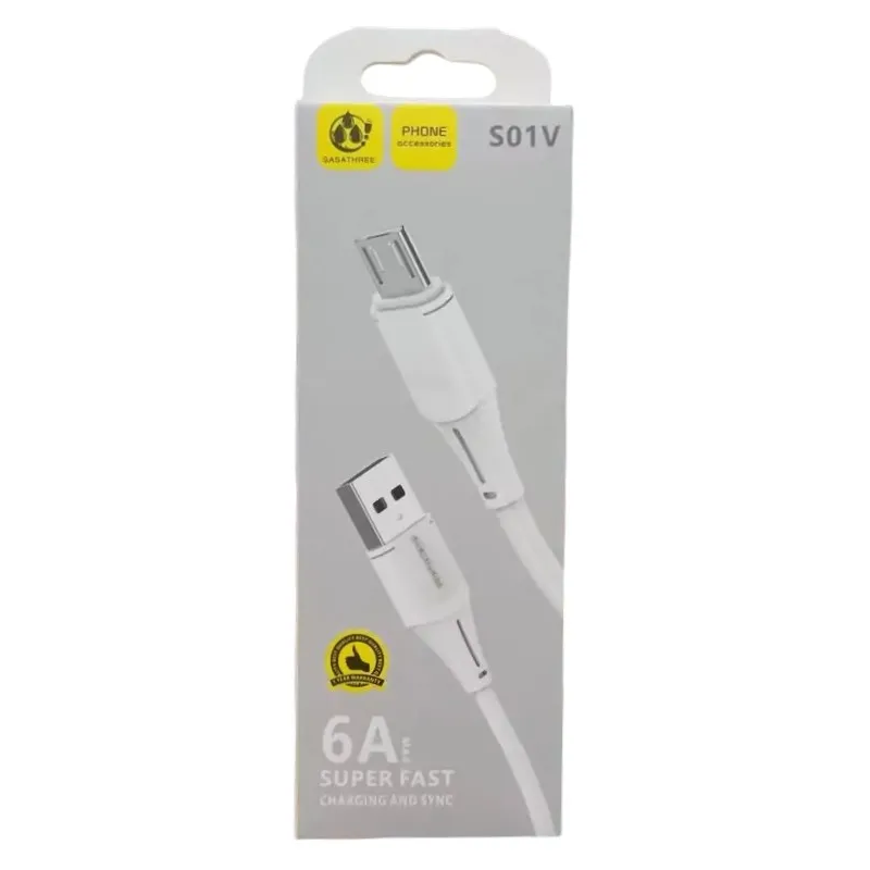 Chargeur Sasathree SC01T - Type de connecteur : Micro USB - Fonction de charge : Charge rapide - Courant : 6 ampères (6A) - Protection contre la surcharge : Conçue pour protéger les appareils pendant la charge - Protection contre les explosions : Offre une couche de sécurité supplémentaire - Couleur Blanc - Garantie 1 an