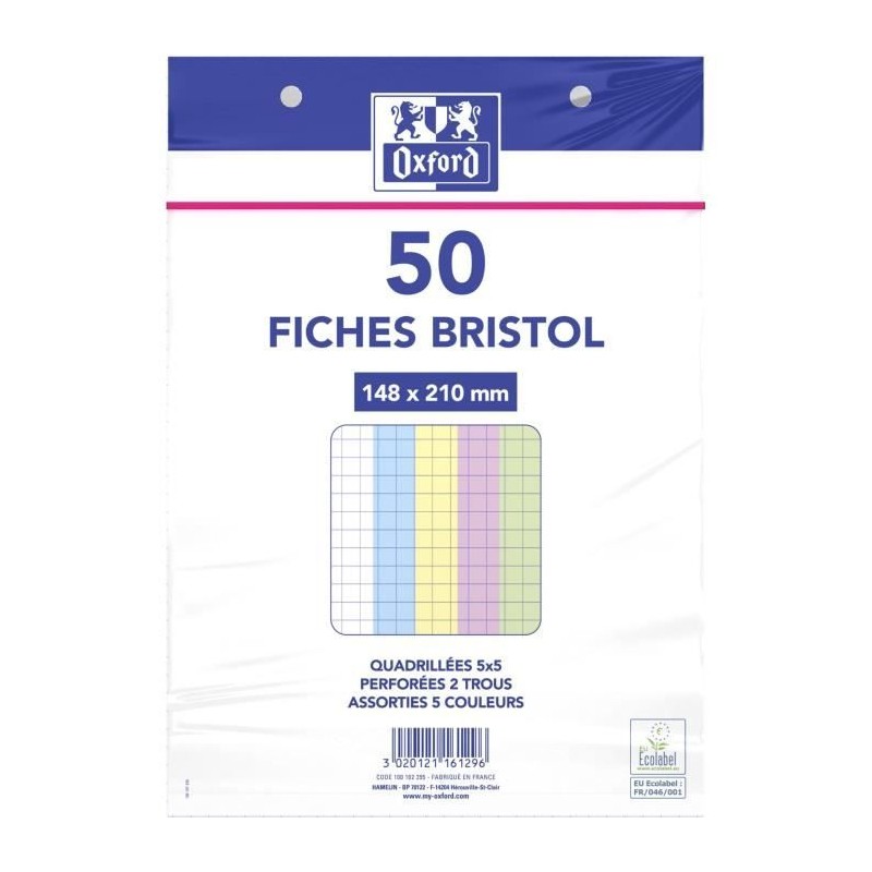 Paquet de 50 Fiches Oxford BRISTOL - Grammage: 210 g/m² - Dimensions: 148 x 210 mm - Format à classer A4 - Petits carreaux 5x5 - Les fiches sont perforées à 2 trous - Feuilles conditionnées sous film plastique - Couleur Bleu