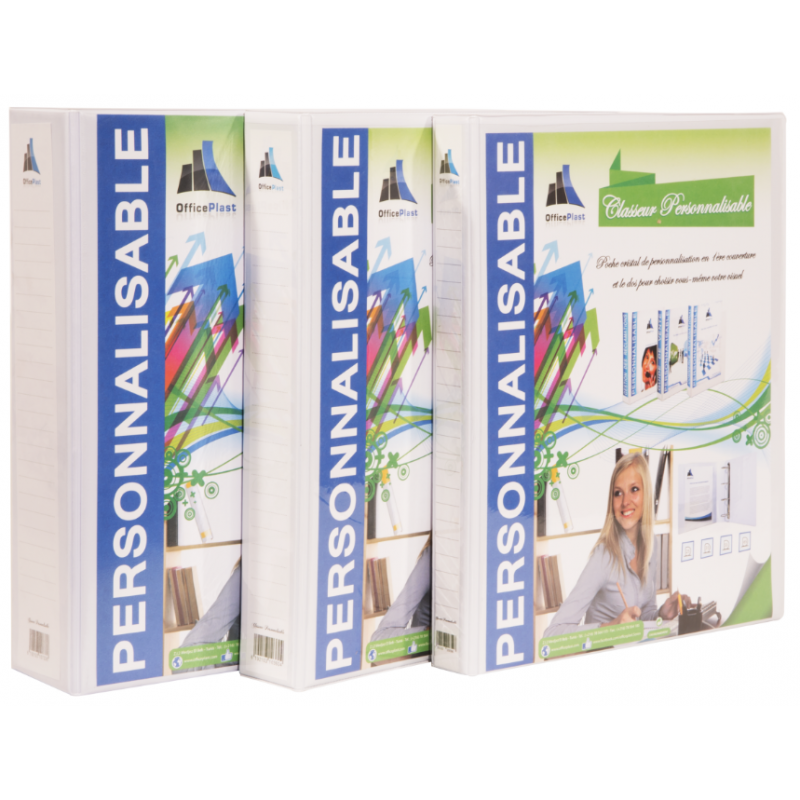 Classeur en PVC Personnalisable D35 - Dos : 50 mm - Format: 24 x 32 cm - Mécanisme semi-automatique 4 anneaux en D - Poche cristal de personnalisation sur 1ère de couverture et dos - Poches intérieures transparentes en 2ème de couverture - Couleur Blanc