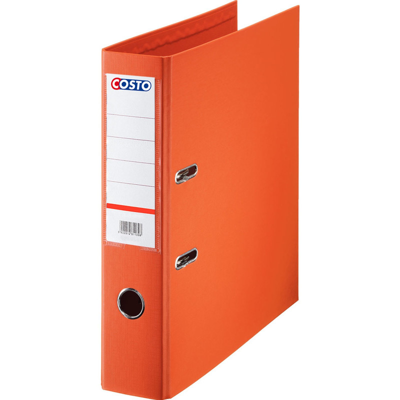 Classeur à levier COSTO Pro Dos A4 PP/PP D75 - 2 anneaux - Largeur de Dos: 75 mm - Format de papier à classer: A4 - Capacité de papier à classer: jusqu’à 600 feuilles perforées - carton fort recouvert de polypropylène - Grand porte-étiquette - Dimensions: 280 x 320 mm - Couleur Orange