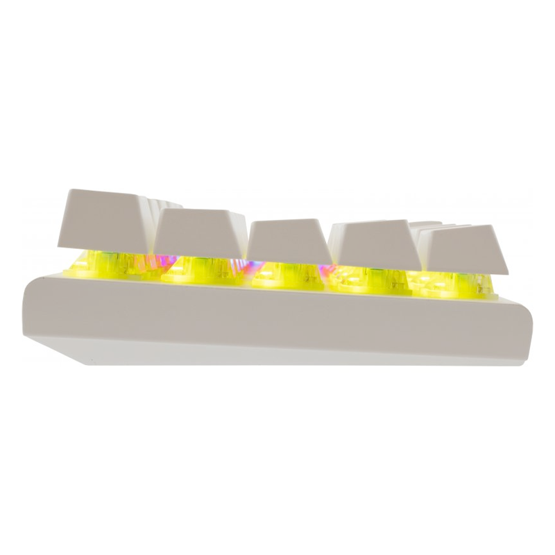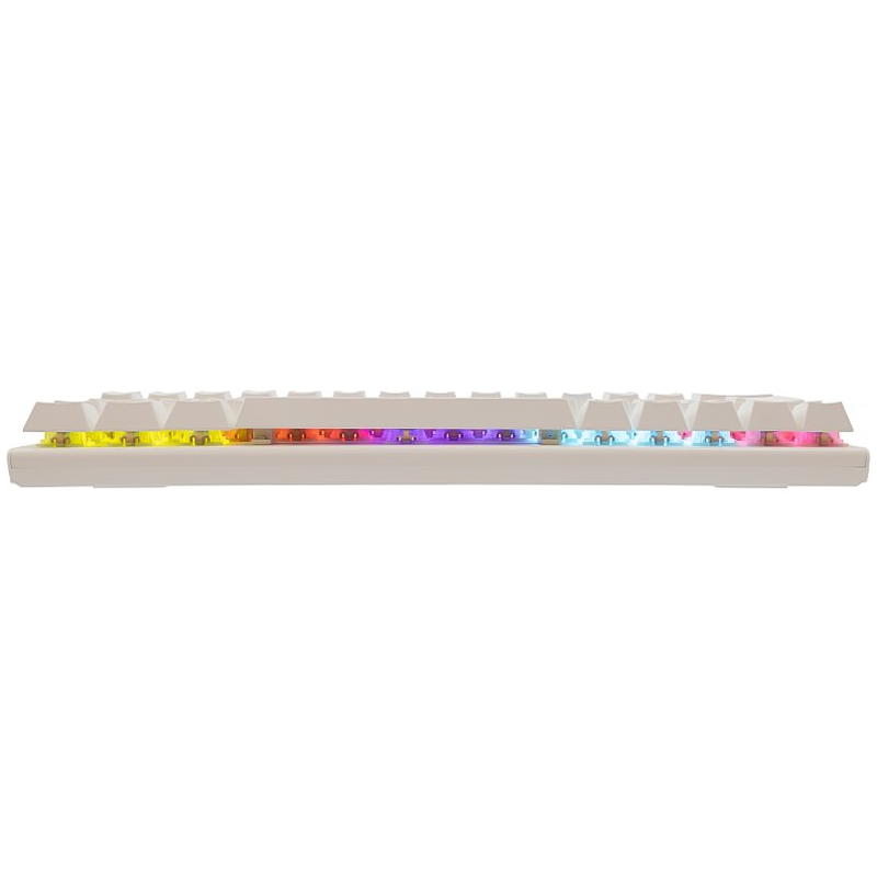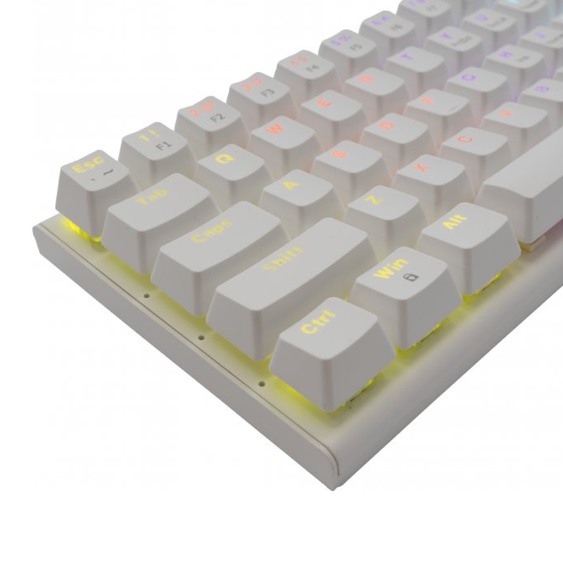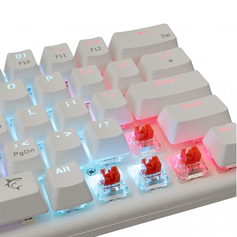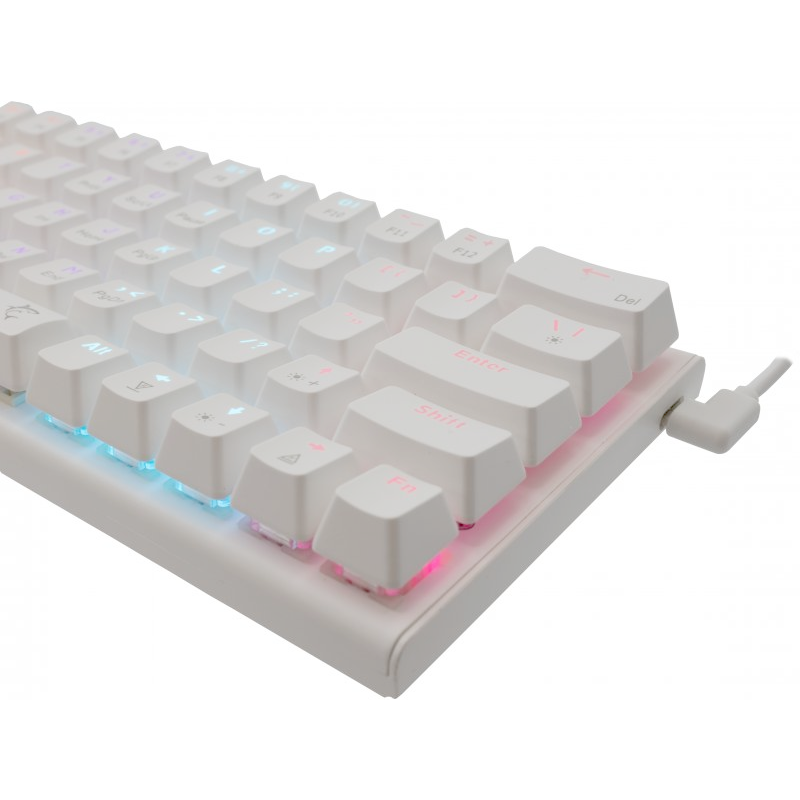 Clavier White Shark WAKIZASHI - Interface : Type C - USB 2.0 (détachable) - Nombre de touches : 63/64 - Type de commutateur : Mécanique - Rouge - Anti-Ghosting : Oui / 26 touches - Eclairage : Effet Rainbow / 17 effets différents - Pattes montantes supplémentaires - Durée de vie : Plus de 50 M de pression - Longueur du câble : 1,5 m - Poids : 430g - Dimensions : 292x105x35mm - Couleur : Blanc