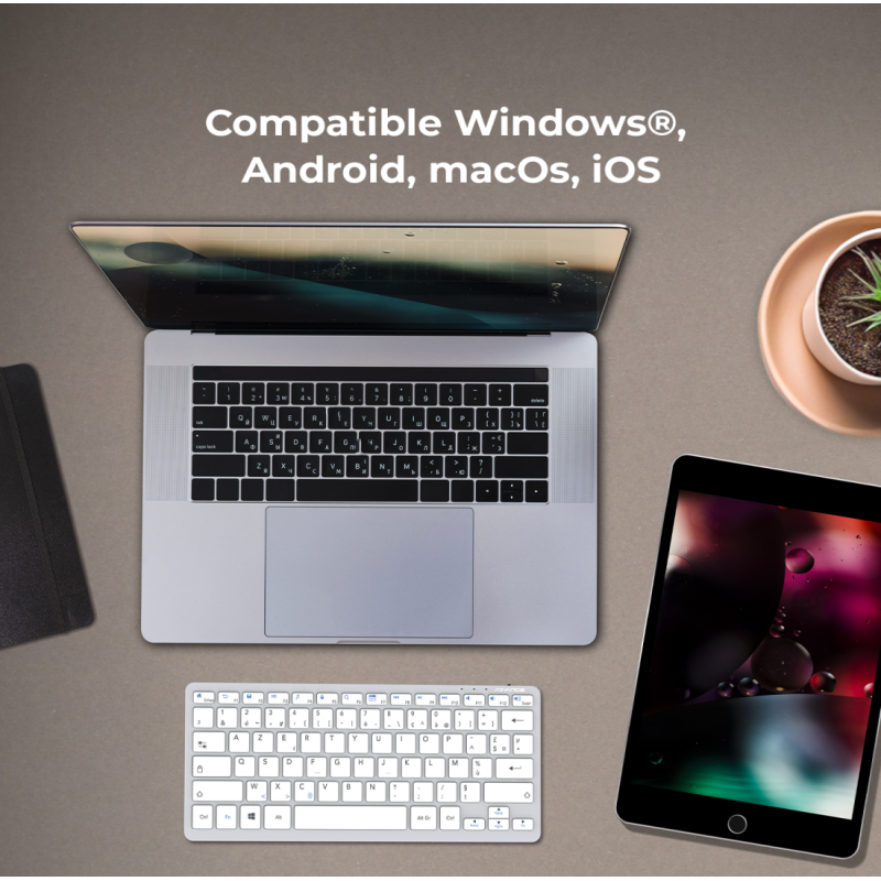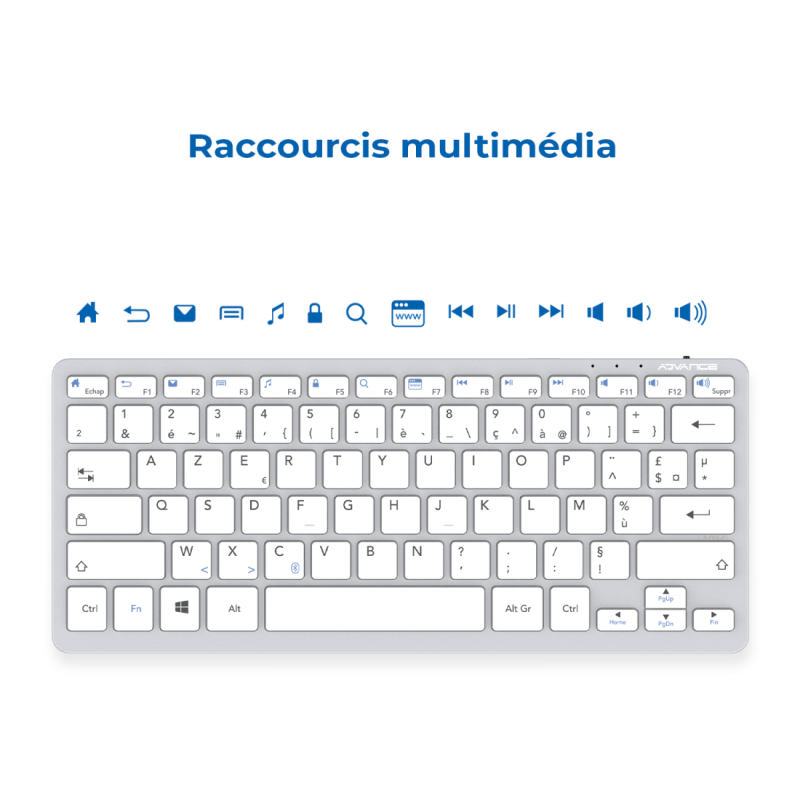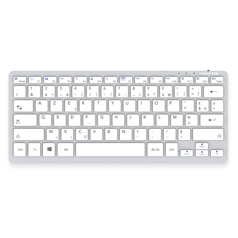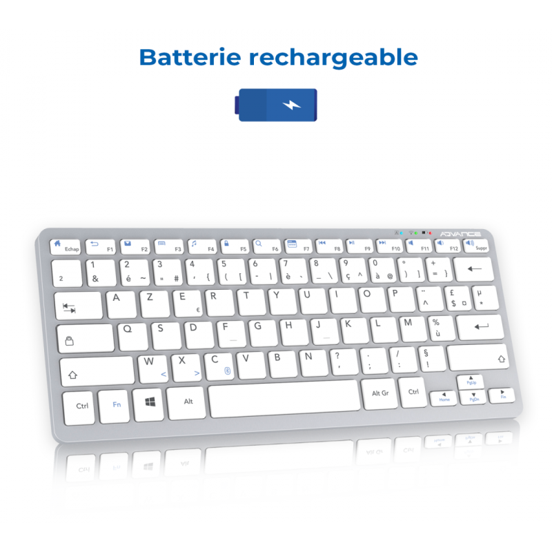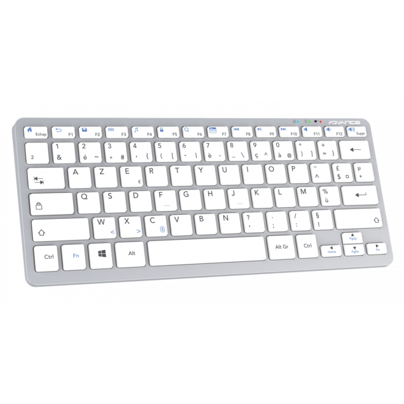 Clavier Sans Fil ADVANCE BT230 - Connectivité : Bluetooth 5.0 - Connexion fluide jusqu'à 10 mètres - Norme Clavier : Azerty / Français - Type de Clavier : Switches ciseaux - Nombre de Touches : 78 touches - Batterie lithium rechargeable 150 mAh - Câble de charge 50 cm - Compatibilité : Windows - Dimensions : 28,6 x 12,1 x 2,2 cm - Poids : 285 g - Couleur : Gris aluminium - Garantie 1 an