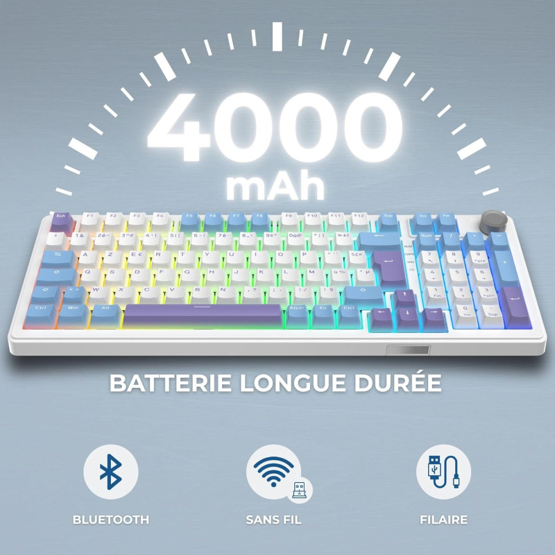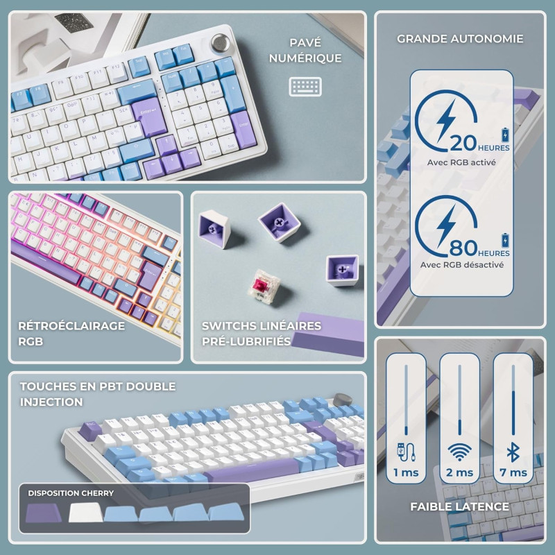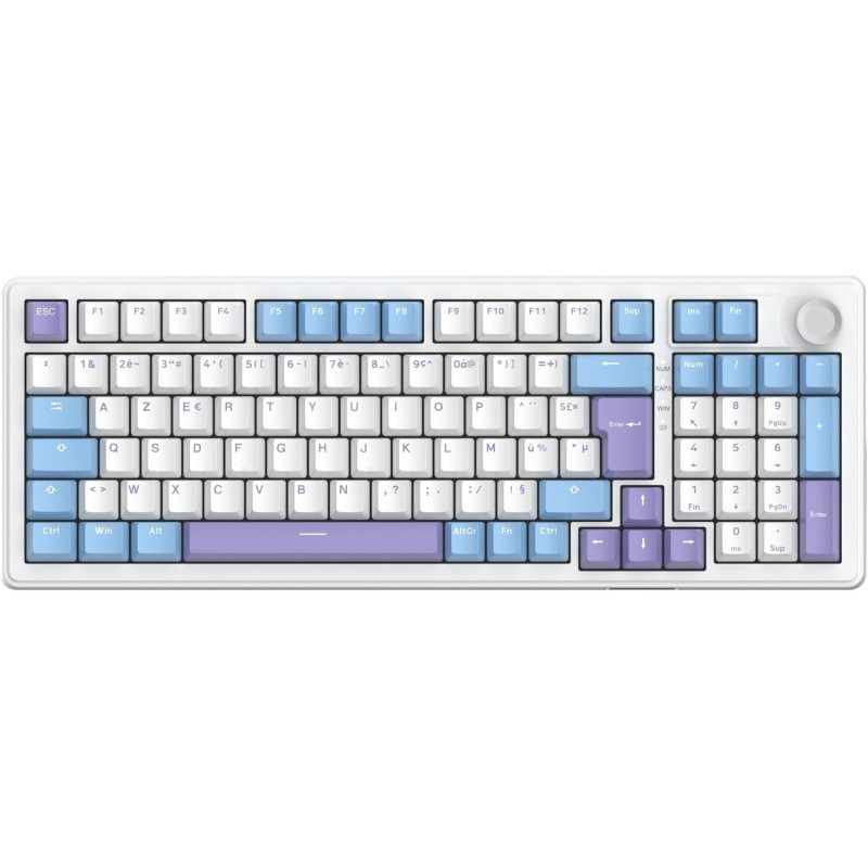 Clavier gaming G-LAB KEYS ELITE 400 - Touches : PBT double injection ultra-résistantes - Disposition : AZERTY Français - Switchs : Mécaniques linéaires pré-lubrifiés, hot-swappable - Structure : Gasket 5 couches – frappe fluide, silencieuse et amortie - Taux de rafraîchissement : 1000 Hz – réactivité instantanée (latence < 1 ms) - Anti-ghosting 100% NKRO - Rétroéclairage : RGB personnalisable (touches + côtés) - Raccourcis multimédias : 12 raccourcis + molette de contrôle multimédia - Type de connexion : Triple mode : 2.4 GHz / Bluetooth / Filaire - Batterie 4000 mAh - Autonomie : jusqu’à 80h d’utilisation - Compatibilité : Windows et Mac/XBOX/PS4/PS5 - Poids : 1.1 Kg - Couleur Blanc / Bleu - Garantie 1an