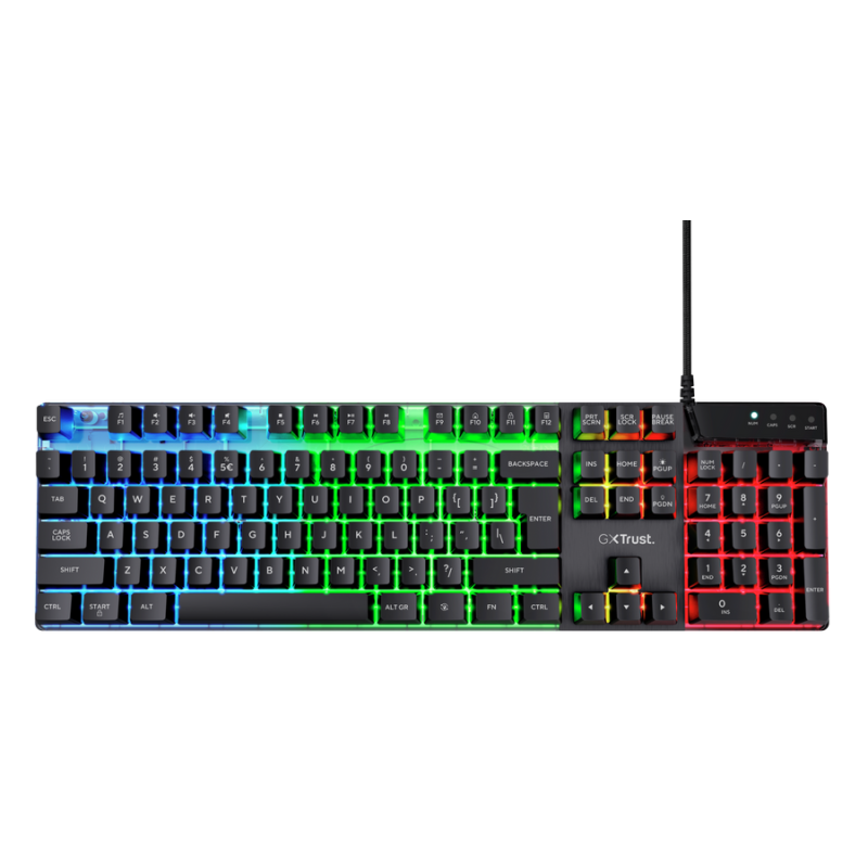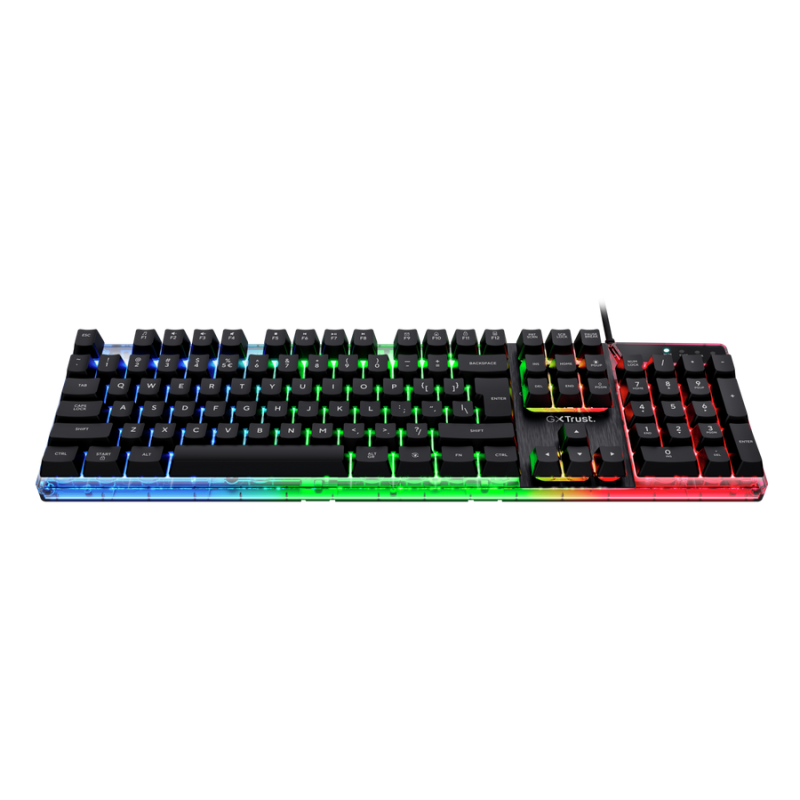 Clavier Gamer Filaire TRUST GXT 835 AZOR - Connectivité : USB - Nombre de clés : 104 - temps de réponse : 8 ms - pavé numérique - Rétroéclairage Arc-en-ciel - Durée de vie de la clé : 5 000 000 presses - Compatibilité : macOS, Windows, Chrome OS - Poids : 589 g - Couleur Noir - Garantie 1an