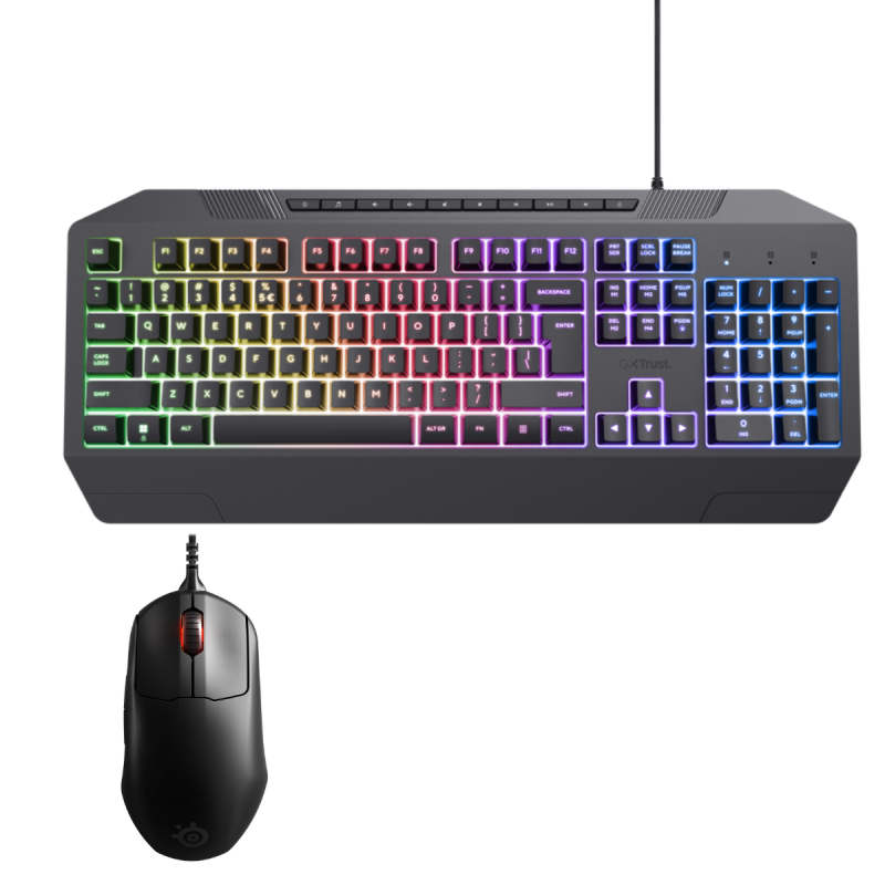 Clavier Gamer Filaire TRUST GXT 836 Evocx - Connectivité : USB 2.0 - Nombre de clés : 114 - pavé numérique - Rétroéclairage RGB - Support de poignet - touches silencieuses - Compatibilité : macOS, Windows, Chrome OS - Poids : 798 g - Couleur Noir - Souris Gaming SteelSeries Prime+ / Noir - Switchs magnétiques optiques SteelSeries OM Prestige - Capteur optique TrueMove Pro+ de 18 000 dpi - Rétroéclairage RGB compatible Prism Sync - Vitesse maximale de 450 ips - Connectivité : Filaire - Poids 71g - Interface : USB - Nombre de boutons : 5 boutons - - Fréquence Capteur : 1000 Hz - Type de Roulette : Bidirectionnelle - Rétro-éclairage LED RGB - Couleur Noir - Garantie 1 an