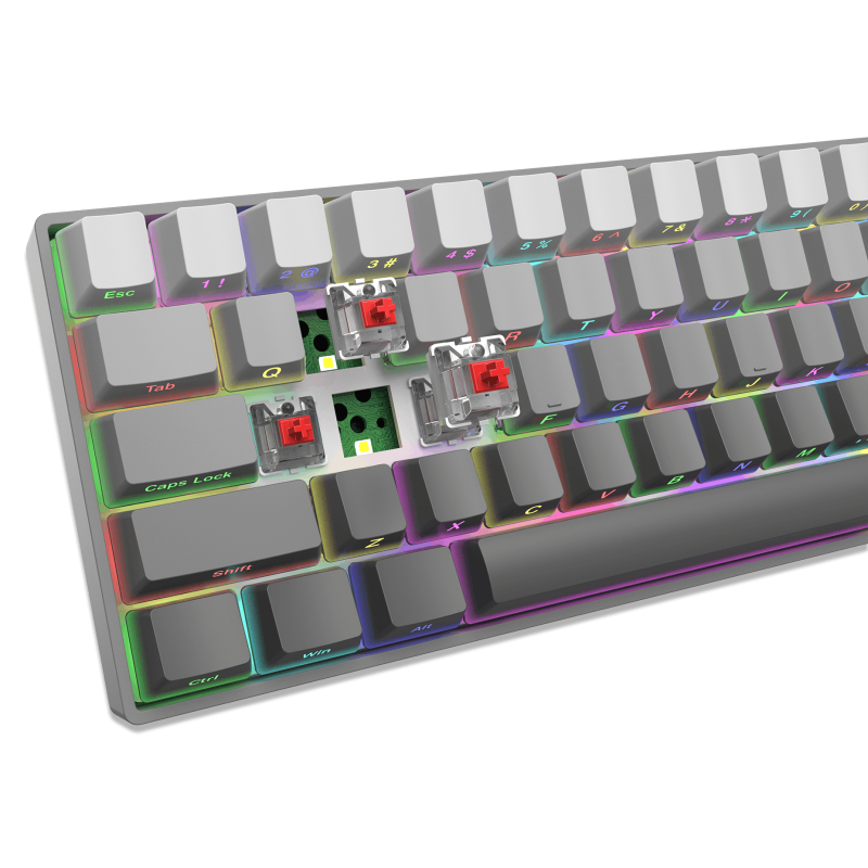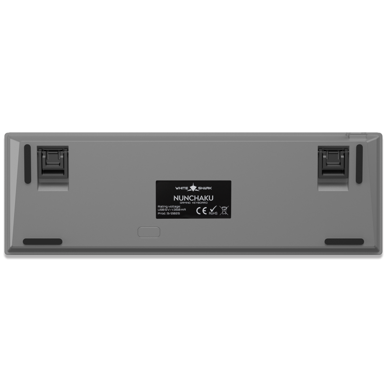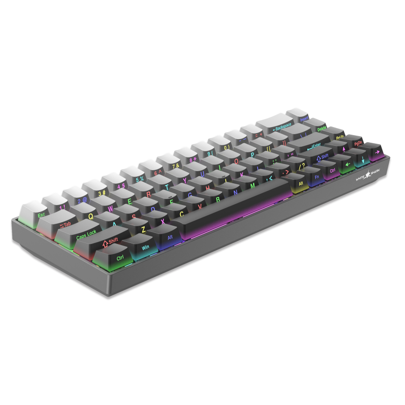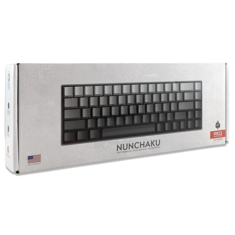 Clavier Gaming Mécanique White Shark GK-00711 NUNCHAKU - Nombre de touches : 68 - Disposition des touches : Compacte - Type de commutateur : Hot-Swap Mechanical Red - Durée de vie : Plus de 50 millions de clics - Éclairage : RGB - Anti-ghosting complet - Interface : Type C - USB 2.0 (détachable) - Pieds supplémentaires relevables - Câble tressé - Longueur du câble : 1,8 m - Matériau : plastique ABS - Dimensions : 310 x 101 x 42 mm - Poids : 550 g - Couleur Gris - Garantie 1 an