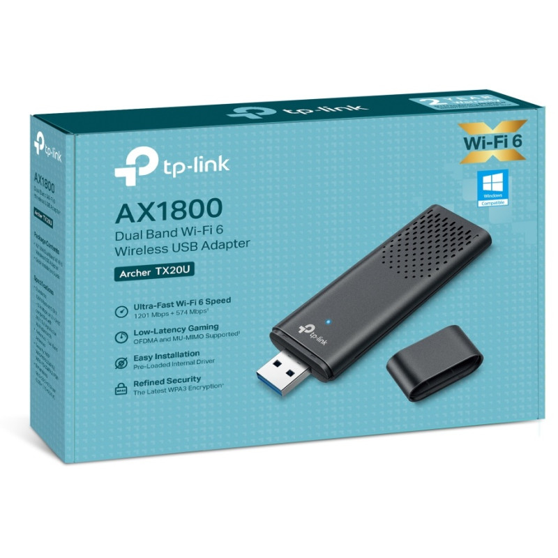 Clé wifi TP-LINK USB Wifi 6 AX1800 - Antennes : 2 antennes bi-bande - Normes Wi-Fi : IEEE 802.11a/b/g/n/ac/ax - Débits Maximaux : 5 GHz : 11ax : jusqu’à 1 201 Mbits/s (dynamique), 11ac : jusqu’à 867 Mbits/s (dynamique), 11n : jusqu’à 300 Mbits/s (dynamique), 11a : jusqu’à 54 Mbits/s (dynamique) | 2,4 GHz : 11ax : jusqu’à 574 Mbits/s (dynamique), 11n : jusqu’à 400 Mbits/s (dynamique), 11g : jusqu’à 54 Mbits/s (dynamique), 11b : jusqu’à 11 Mbits/s (dynamique) - Modes Wi-Fi : Mode infrastructure - Sécurité WiFi : WEP, WPA/WPA2/WPA3, WPA-PSK/WPA2-PSK - Puissance de transmission : 5 GHz : 19 dBm (FCC) / 21,5 dBm (CE) (PIRE) / 2,4 GHz : 19 dBm (FCC) / 18,5 dBm (CE) (PIRE) - Température de fonctionnement : 0 °C à 40 °C - Dimensions (L x P x H) : 90,2 × 29,2 × 12,9 mm - Garantie 1 an