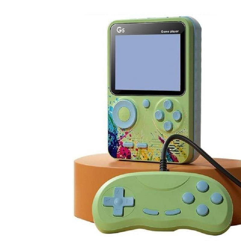 Console De Jeu GameBOX G5 Avec Manette - Nombre de jeux intégrés: 500 Jeux - Écran 3" TFT - Capacité de batterie: 1020 mAh - Autonomie: 7 heures - Batterie rechargeable intégrée - Mémoire: 256 Mo - Compacte, colorée et facile à transporter - Types de jeux: RPG Jeu de rôle, Action ACT, Aventure AVG, autres - Prise en charge des jeux 8 bits - Interface de Chargement Micro USB - Couleur Vert - Garantie 1 an