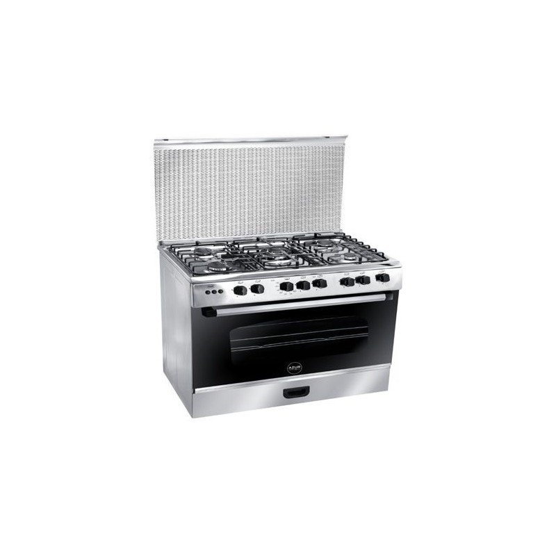 Cuisinière Azur - 5 Feux - Couleur Inox - Allumage automatique - Tourne broche - Couvercle en verre - Thermostat - Lampe au four - Minuterie - Dimensions 60 x 80 x 85 cm - Garantie 3 ans
