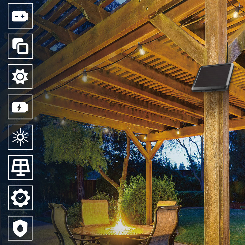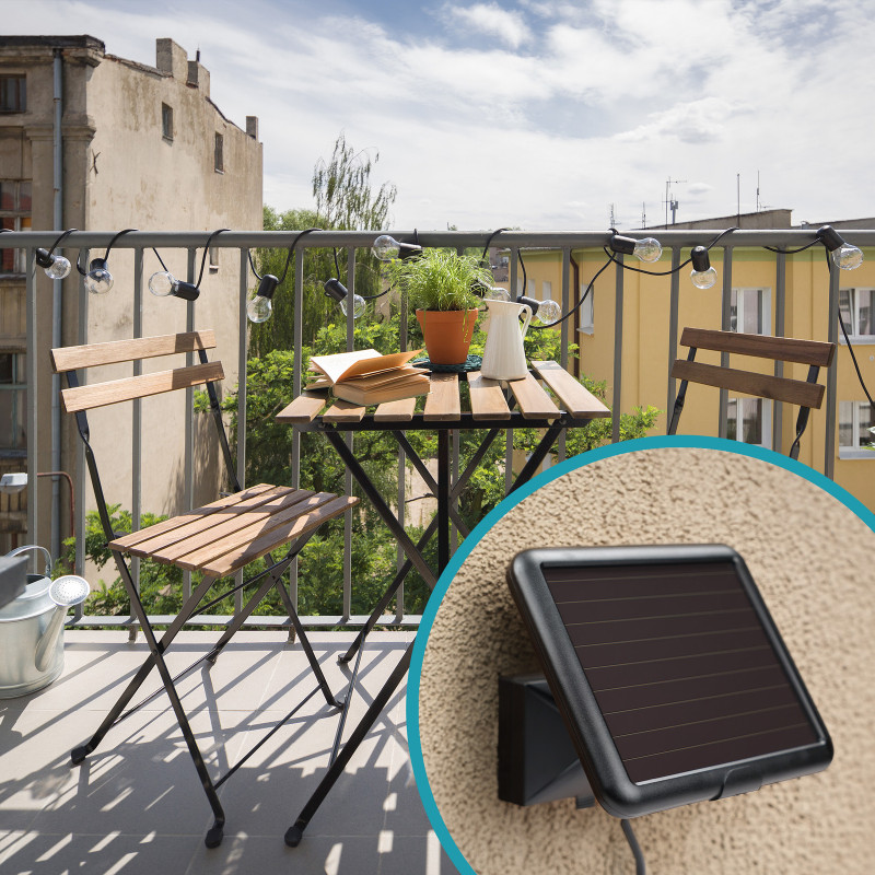 Guirlande solaire LED Forever Light SUNARI - Couleur claire : Blanc chaud - Température de couleur : 3000K - Capacité de la batterie : 1500 mAh - Type de batterie : Li-ion - Autonomie de la batterie : 8 heures - Temps de charge solaire (en plein soleil) : 8 heures - Alimentation électrique : panneau solaire - Type de panneau solaire : Silicone amorphe - Nombre de diodes : 10 pièces - câble : 7,5 mètres - Taille du panneau solaire : 165 x 133 mm - Matériel : PC, ABS - L'indice d'étanchéité IP44 - Température de fonctionnement : -20°C à +50°C - Poids net : 1 170 g - Garantie : 1 an