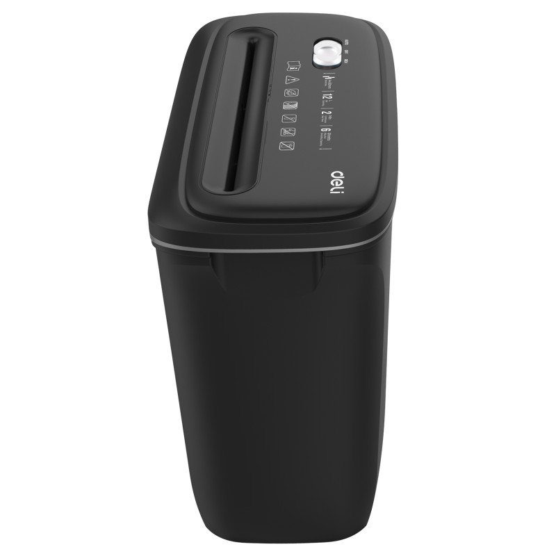 Destructeur de papier Deli-E9945 - Dimension: 239 × 156 × 390 mm - Matière: Acier au carbone nitruré, ABS - Capacité de déchiquetage 6 feuilles (70gsm) - Type de coupe Déchiquetage croisé : papier, CD, carte de crédit - Niveau confidentiel: 3 - Taille des confettis: 4 × 25 m - déchiquetage: 220 mm A4 - Corbeille 12 L - Vitesse: 3 mètres/min - Protection contre la surchauffe: 5 min - Couleur Noir - Garantie 1 an