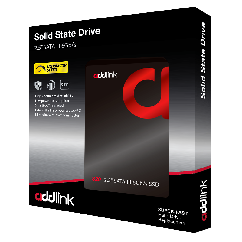 Disque Dur SSD Addlink S20 - Format 2.5" - Capacité 120 Go - Épaisseur 7mm - Interface SATA III 6Gb/s - Vitesse de transfert de données: 510 Mbps (Lecture) / 400 Mbps (Ecriture) - Technologie 3D NAND - Compatible avec Windows, Mac OS X, Linux - Garantie 3 ans