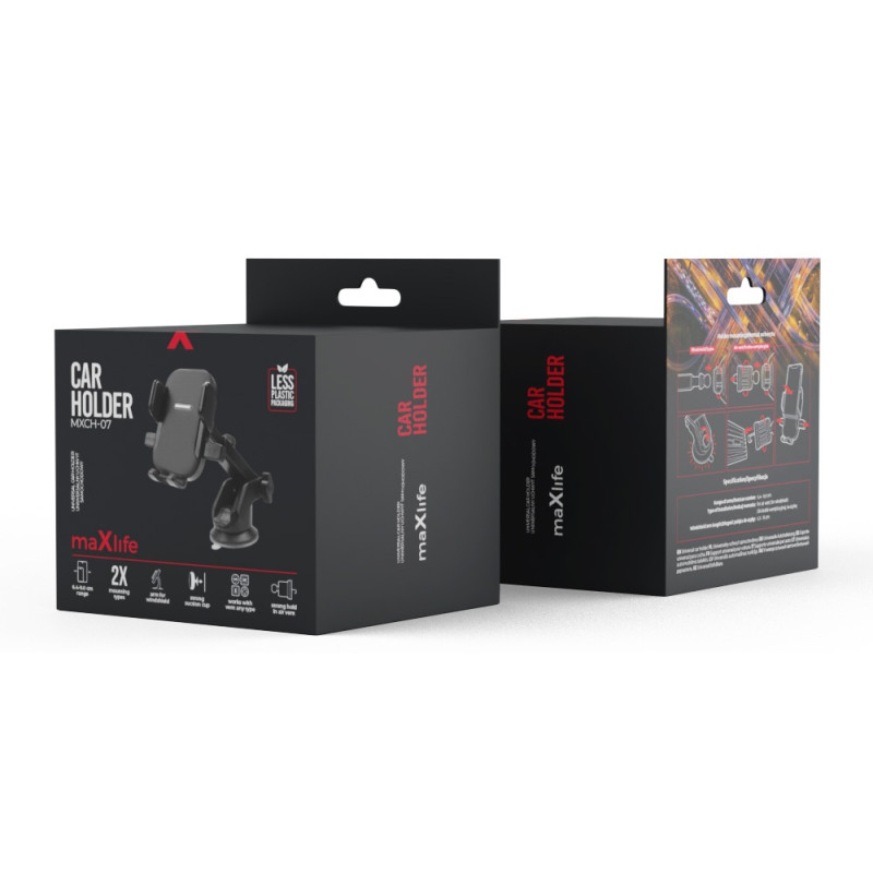 Support voiture Maxlife MXCH-07 - adapté à plusieurs types d’appareils - Montage facile et rapide - Possibilité de charger l'appareil - accès aux ports - Montage stable - Plage d'ajustement : 6,4-9,0 cm - Couleur Noir